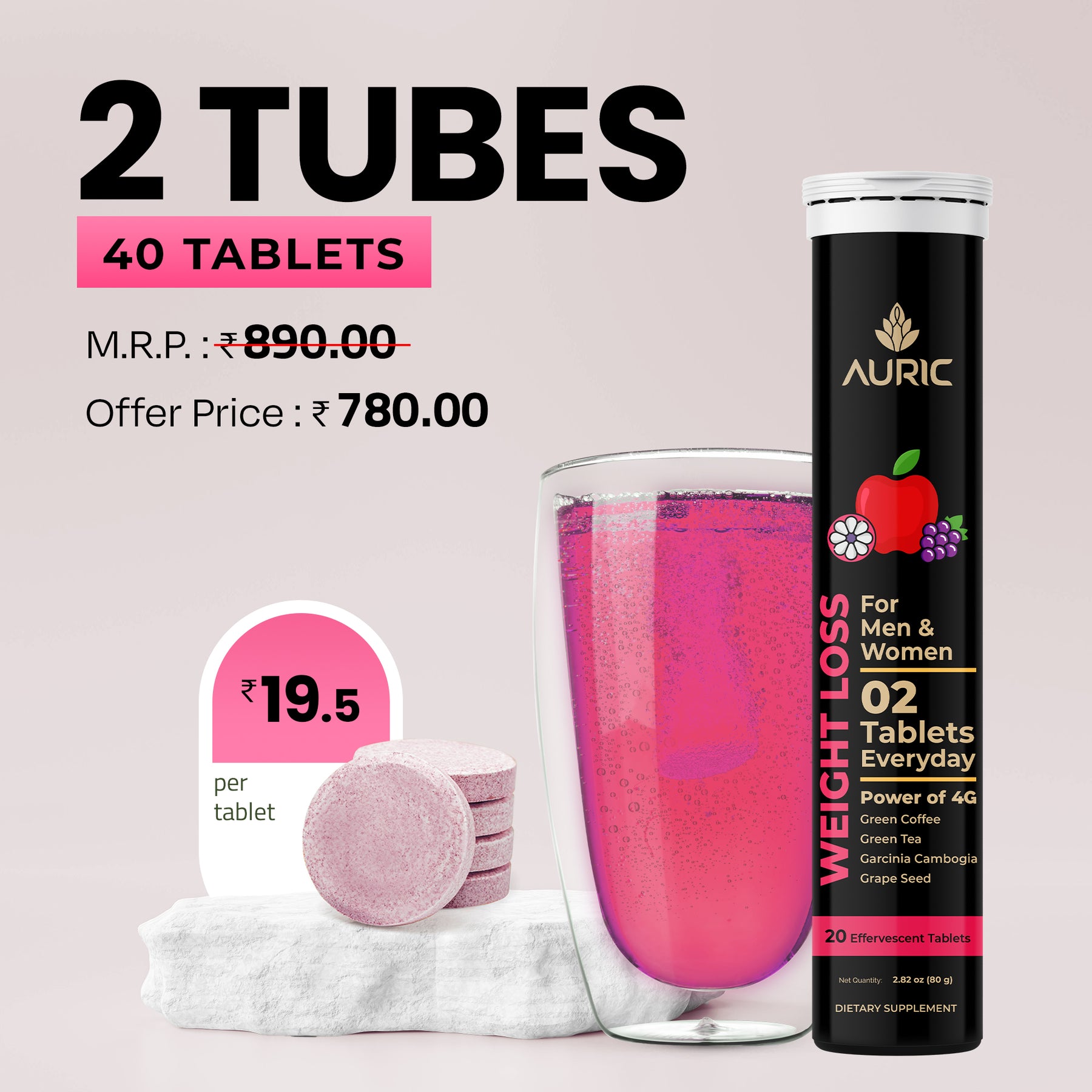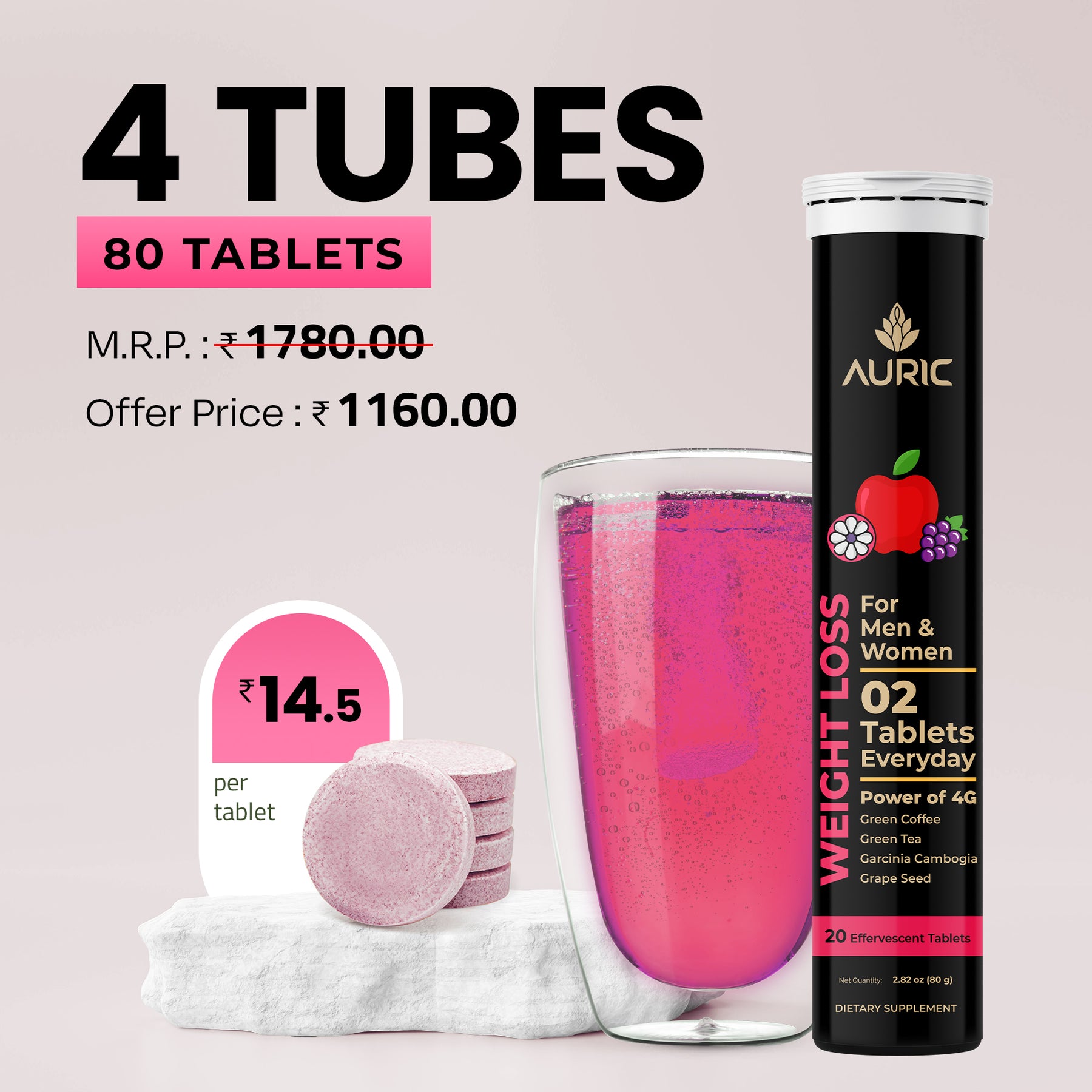 Auric Weight Loss is a thoughtfully crafted effervescent tablet made from carefully selected Ayurvedic herbal extracts. Each tablet is designed to dissolve quickly in water, creating a fizzy, flavorful drink that is convenient to consume anytime, anywhere. The formulation brings together a blend of four plant-based herbal extracts — Garcinia Cambogia, Green Tea, Green Coffee, and Grape Seed — in a precise combination.