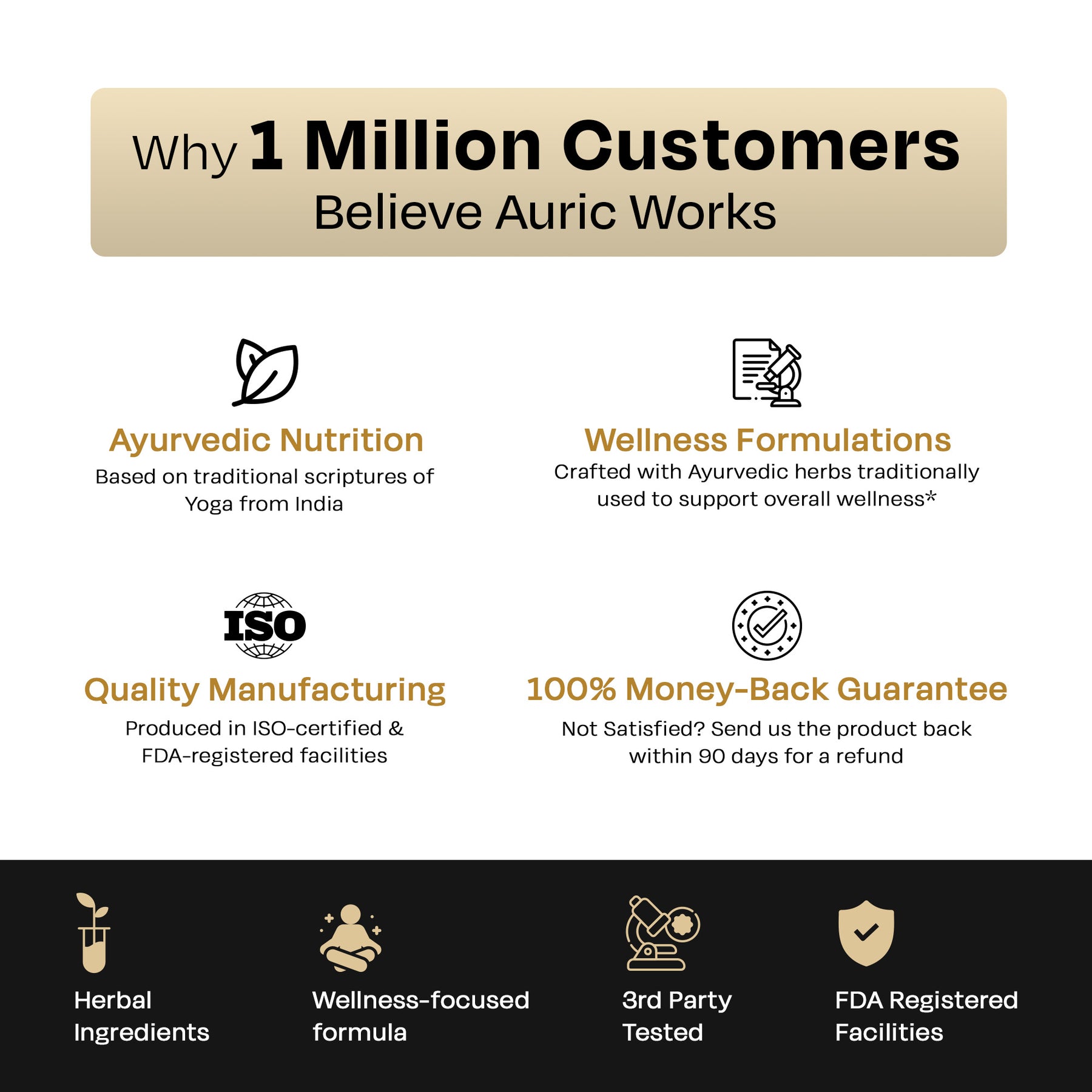 Auric products are formulated with plant-based, ayurvedic ingredients that are generally recognized as safe when used as directed. However, individual responses to herbs and botanicals may vary. If you are pregnant, nursing, under medication, or managing a medical condition, we recommend consulting your healthcare professional before use.